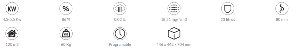 ● Cristal Vitrocerámico 750 oC. ● Programación Semanal. ● Interior Cámara en Acero. ● Quemador de Fundición. ● Electrónica con Display de 4 Botones. ● Equipo Pintado con Pintura Anticalórica 800 oC. ● Revestimientos Pintados en Pintura Epoxi. ● Elaborado en Acero de hasta 5 mm. ● Sistema de Cristal Limpio. ● Salida de Humos 80 mm Lateral Derecha y/o Trasera.